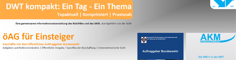 Die Veranstaltung konzentriert sich vor allem auf die Aufgaben des Bundesamts für Ausrüstung, Informationstechnik und Nutzung der Bundeswehr (BAAINBw) als öffentlicher Auftraggeber (öAG). Es werden die Organisation, das Aufgaben- und Rollenverständnis des BAAINBw, der Prozess der öffentlichen Vergabe sowie die Spezifika von Beschaffung in ausgesuchten Themen vertieft. Sie bietet Informationen über Prozesse und Verfahren für Einsteiger in den Markt. Mit Blick auf den Aspekt „Innovationen erschließen“ wollen wir nicht nur mittelständische Unternehmen, sondern auch bewusst Startups ansprechen.